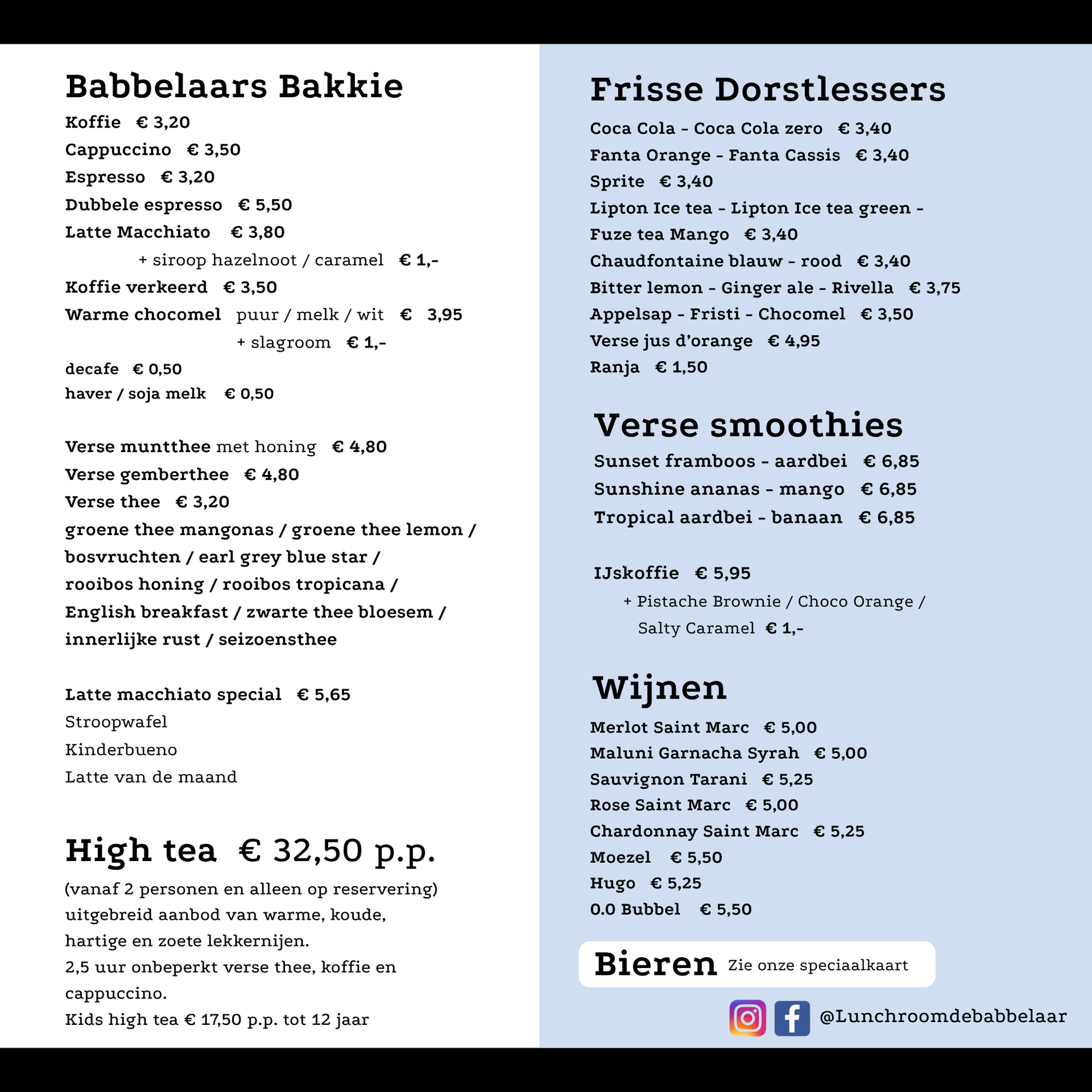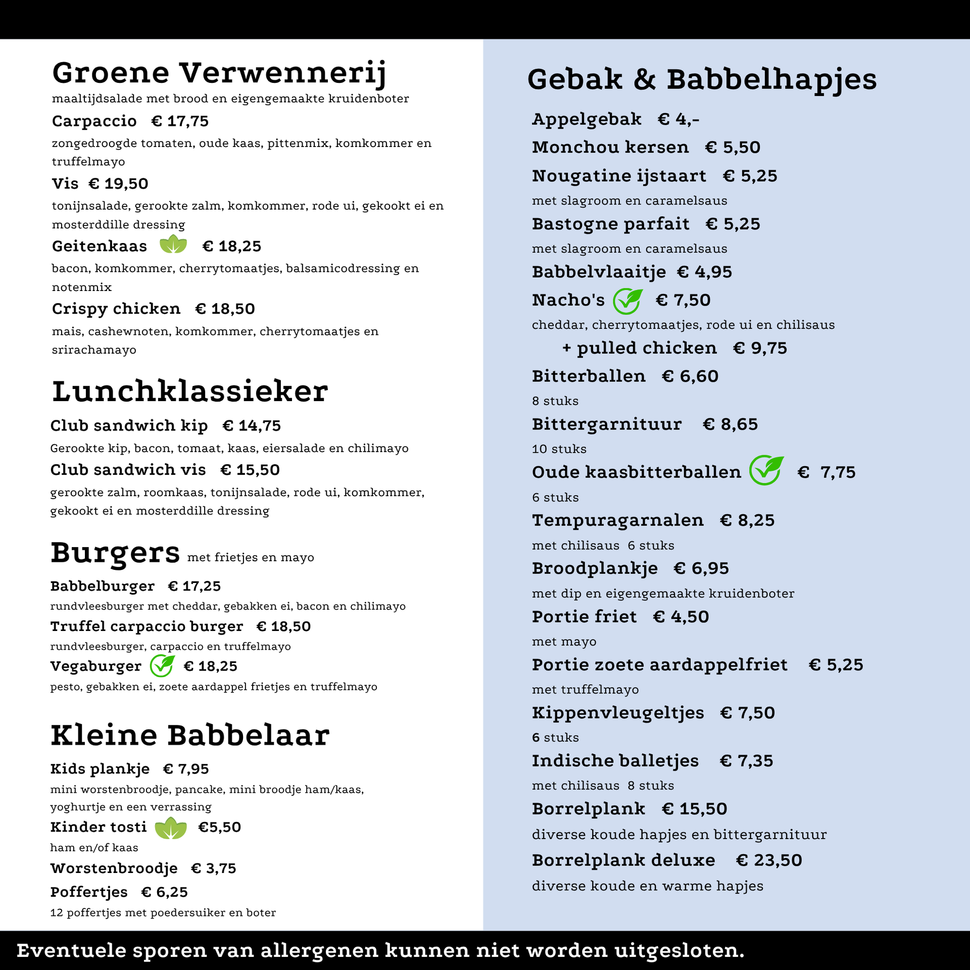 Bij De Babbelaar streven we ernaar om jouw bezoek zo aangenaam mogelijk te maken! Of je nu komt voor een heerlijke lunch, een special van het huis of een gezellige high tea, we willen ervoor zorgen dat iedereen kan genieten van ons aanbod. Heb je een allergie of specifieke dieetwensen? Geen probleem! Neem gerust contact met ons op, zodat we hier rekening mee kunnen houden en een passende oplossing kunnen bieden.